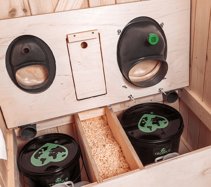 Trobolo®-TinyBloem bij Ecosave, een compact, houten droogtoilet met urine-scheiding en ingebouwde ventilatie, zorgt voor een geurloos toilet en zeer prettig in gebruik.